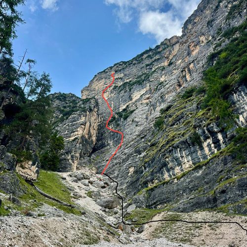 Zustieg: Von St. Vigil in Enneberg, 9 km Richtung Pederü fahren, hier ausgeschilderter Parkplatz rechts von einer Wiese, welche man überquert. Weiter geht es vorbei an einer kleinen Almhütte (in den Sommermonaten bewirtschaftet), dann über eine breite Rinne in ca 20 Min. zum Einstieg.