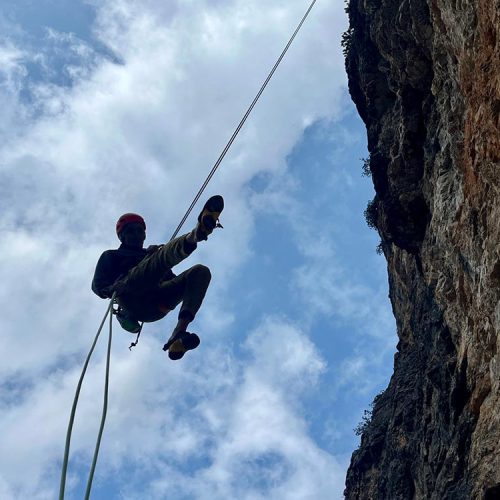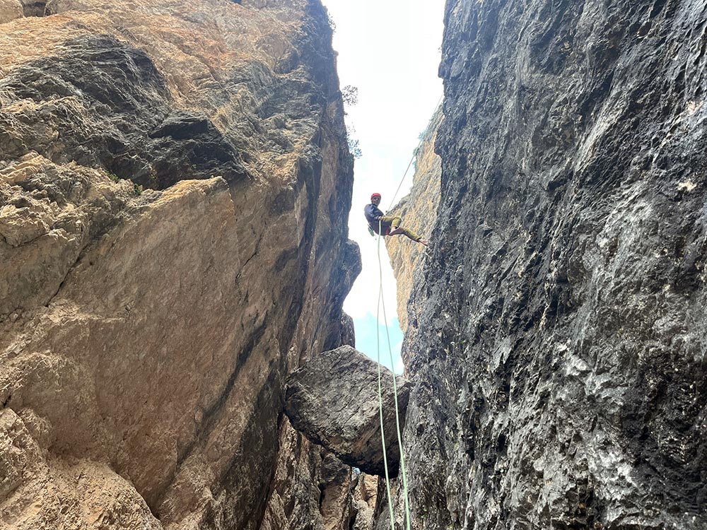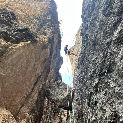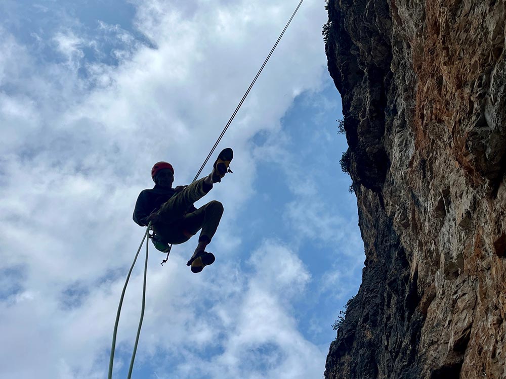 Abstieg: (Ca. 1 Stunde). Man seilt die gesamte Wand ab. Nach dem 3. Abseiler hängt ein Stück Fixseil, damit kann man sich nach rechts ziehen um den nächsten Abseiler zu erreichen. Den 5. Abseiler seilt man senkrecht hinunter und erreicht rechts den Stand. Nach dem 7. Abseiler kann man entweder zu Fuß absteigen oder an der linken Wand noch weitere 4 Mal abseilen.