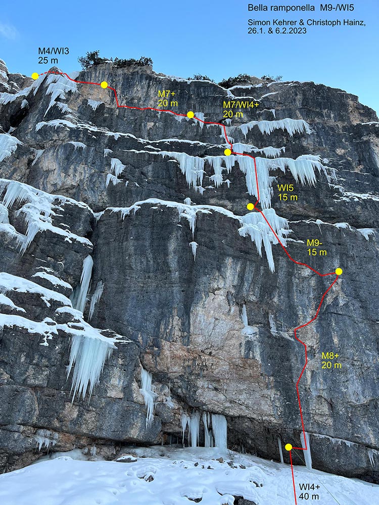 ”Bella Ramponella” si chiama la nostra via nuova poco dopo il rifugio Pederü. La via e protetta con spit, servono . La via arriva fino al M9- e WI 5+ Discesa con 3 doppie 30m-20m-30m