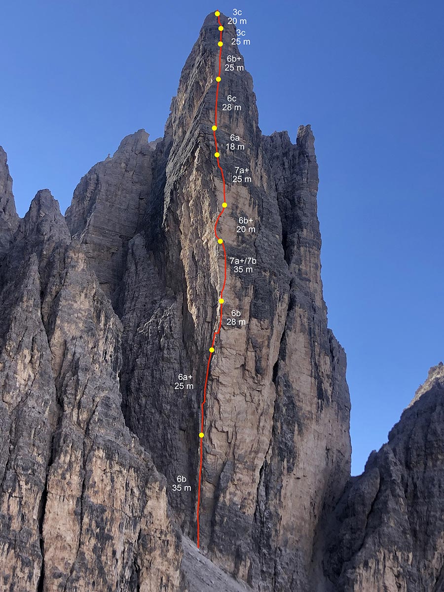 Difficoltà: – 7b, continuato 6b-6c (oblig.6b+) 11 tiri.
