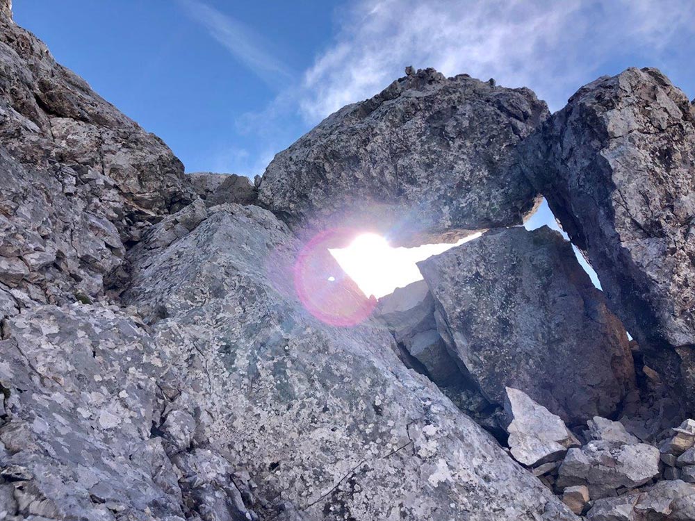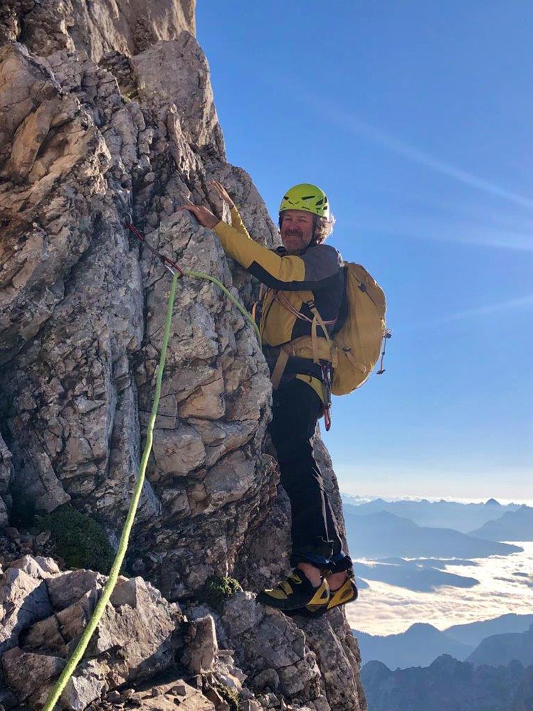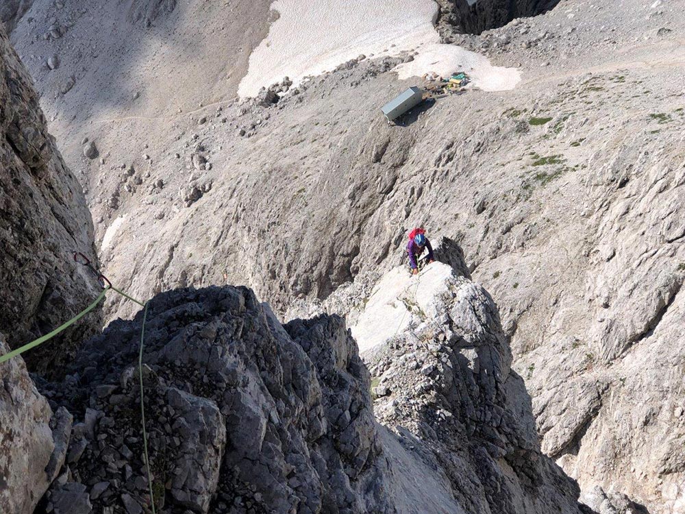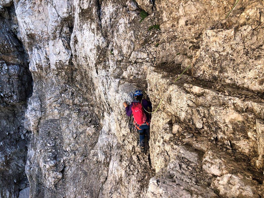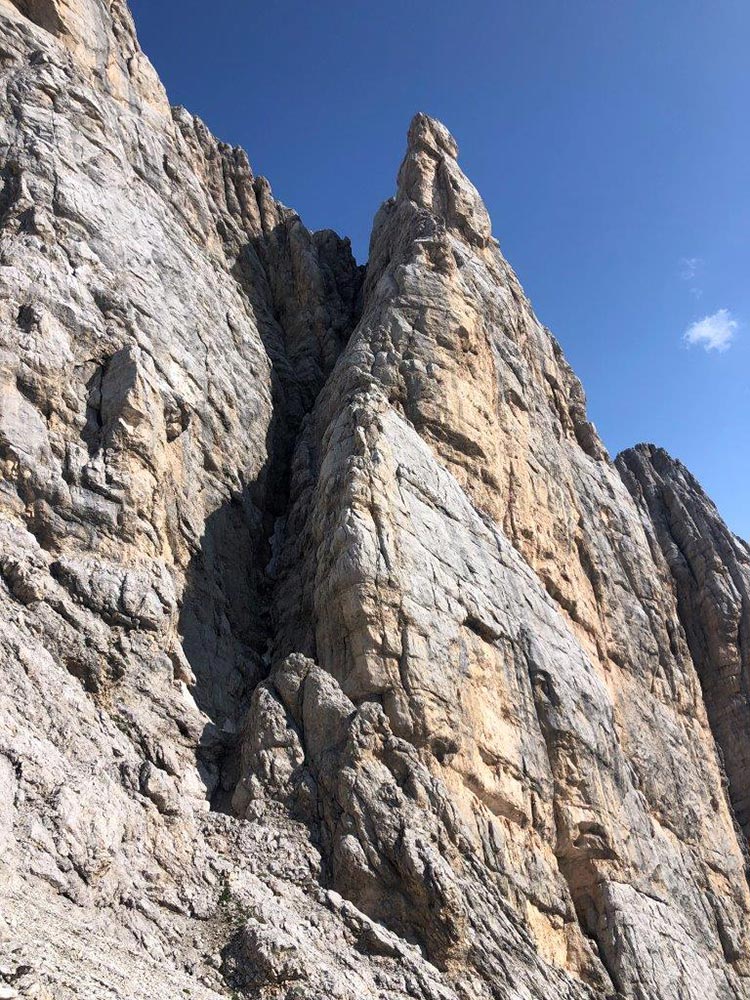 Carattere: fessure e placche belle, riparte su roccia compatta. Salita dal Val da Rin al nuovo bivacco Fanton ca. 3 ore