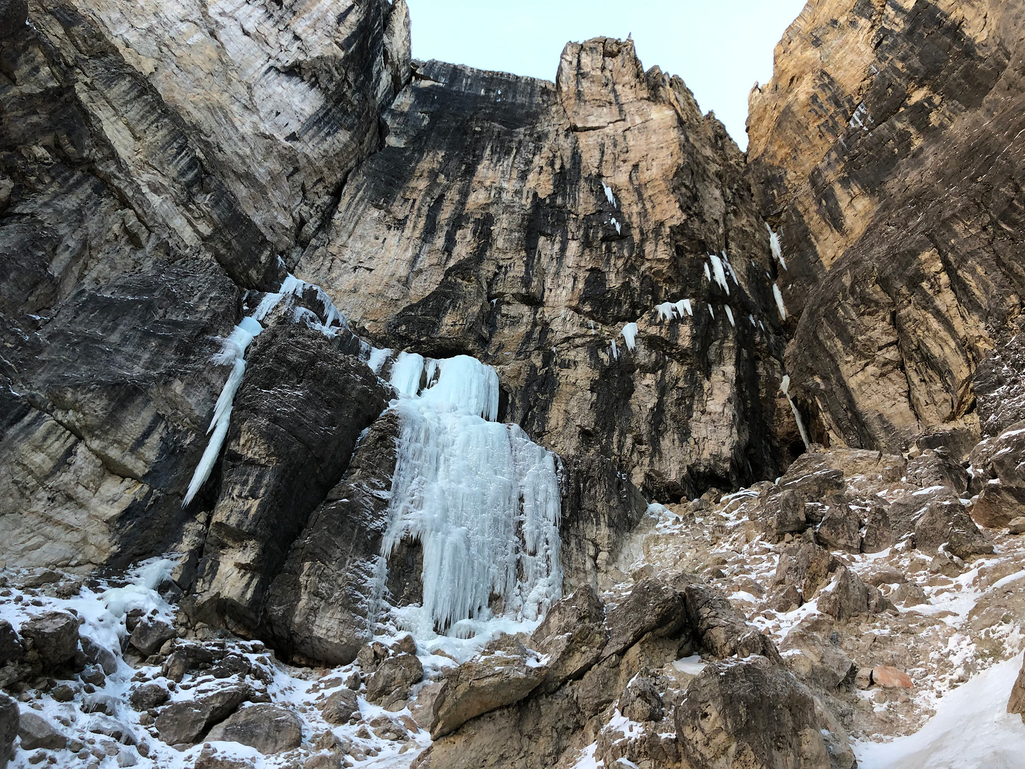 Zustieg: Von Klausen nach Wolkenstein bis zum Parkplatz am Eingang des Langentals. Weg Nr. 14 folgen bis zum flachen Talboden Pra da Ri, dann links vorbei am Val de Lietres bis unter die Felswände des Col Turont. Nun rechts durch eine Rinne hinauf (1 kurze Stelle III+) zur gut sichtbaren Wand mit den Eisfällen (insgesamt ca. 2,5 Stunden). Am besten mit Tourenski.