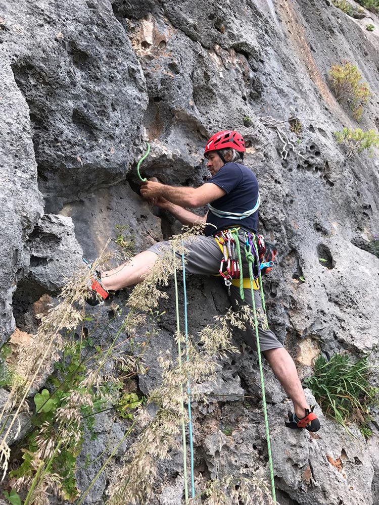 Material: 50-m-Einfach- oder -Doppelseil (empfehlenswert für einen Rückzug), 14 Expressschlingen, einige Bandschlingen. Die Route ist mit Bohrhaken und Sanduhren abgesichert, die Stände sind gebohrt und teilweise mit Ketten und Ring versehen.